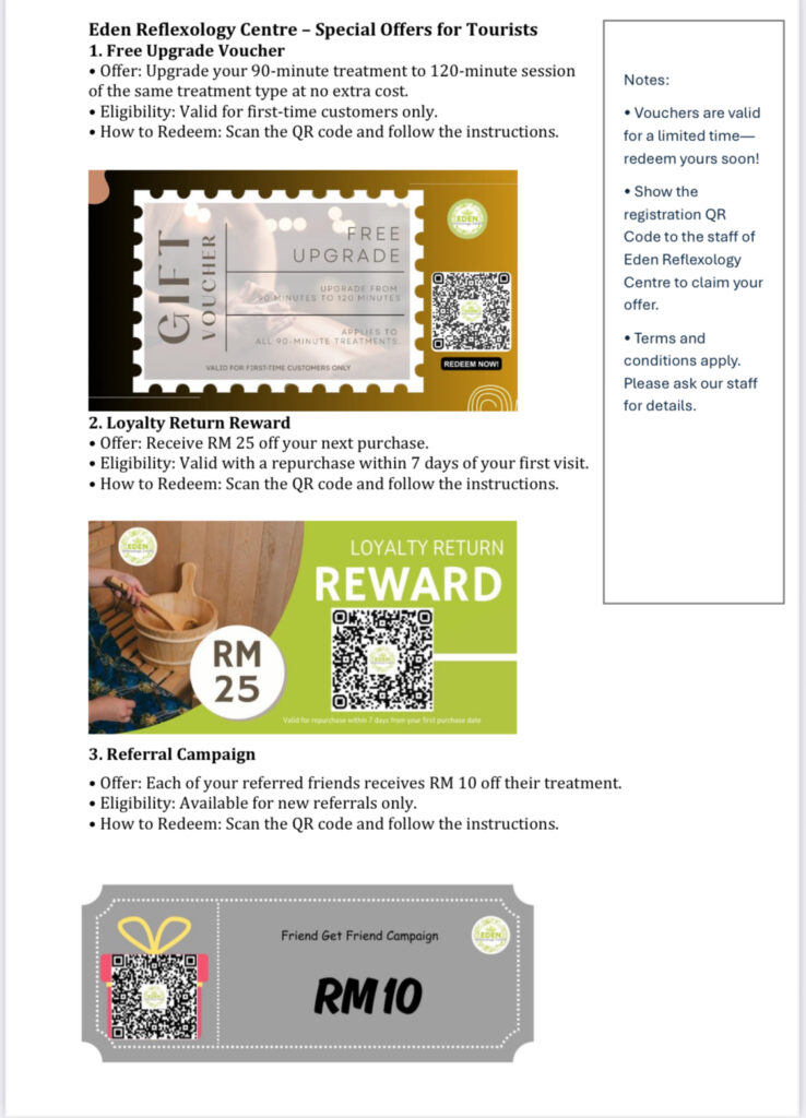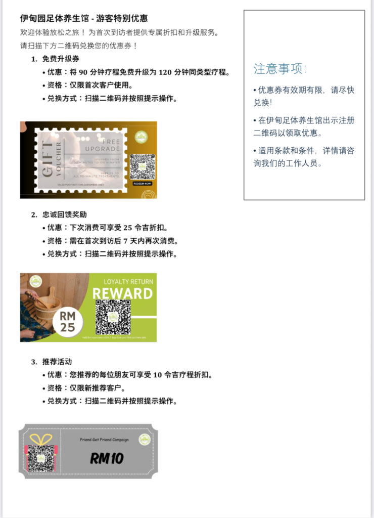 Membership / Tourists BenefitsElevate your Kota Kinabalu getaway with our tourist exclusives! First-timers: Upgrade 90-min treatment to 120 mins free. Return within 7 days for RM25 off. Refer friends for RM10 off their visit. Scan QR codes to redeem—limited time only!