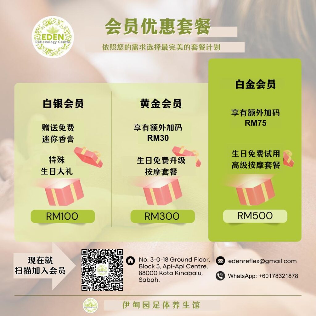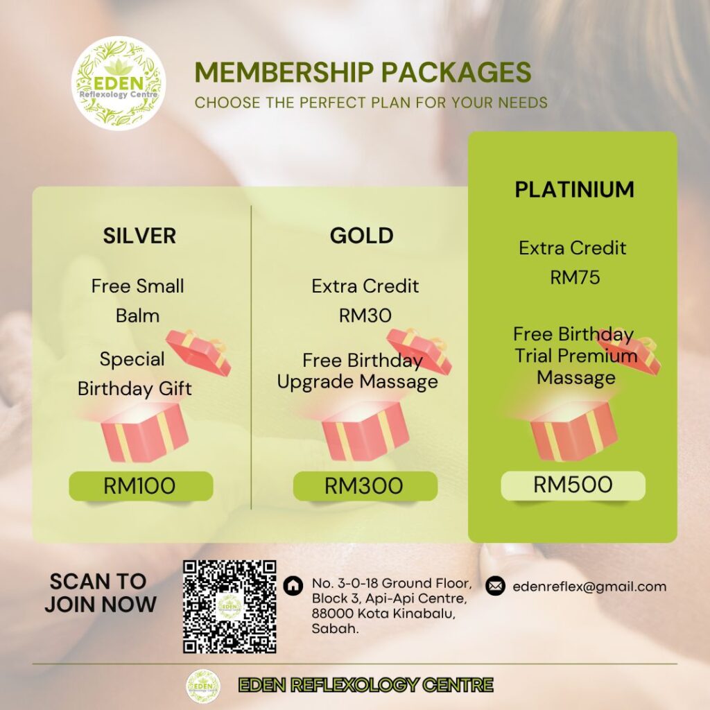 Enhance your wellness journey with Eden Reflexology Centre’s membership subscriptions! Enjoy exclusive benefits such as a free small balm (Silver), extra credit (Gold, RM30; Platinum, RM75), free birthday upgrades (Gold) or a premium trial massage (Platinum), and special discounts on packages like foot, head & shoulder massage (17% off for members until Oct 31st, 2025). Join now for as low as RM100 and experience tailored relaxation and savings!